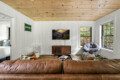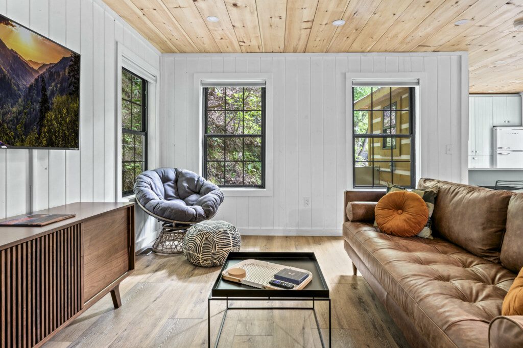 The dining area comfortably seats four, perfect for family meals, board games, or just sitting around debating who’s the best at roasting marshmallows. The spacious living area invites you to kick back on the comfy sofa, enjoy a movie on the flat-screen TV, or simply bask in the glow of the natural light streaming in through the windows.
