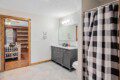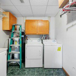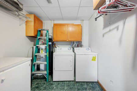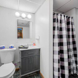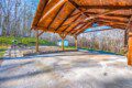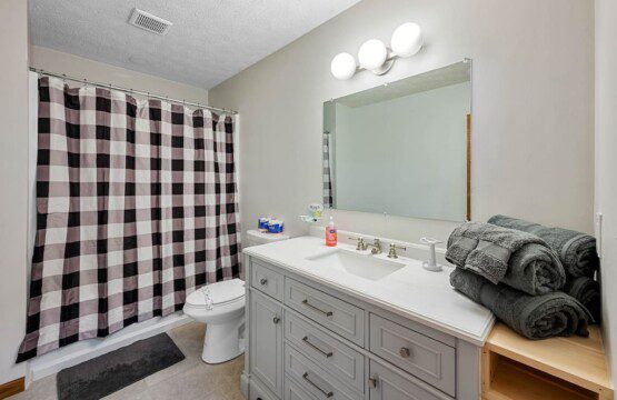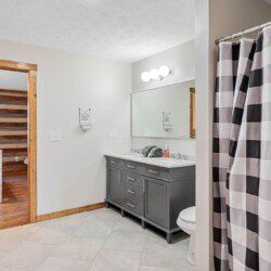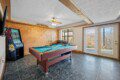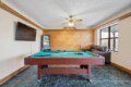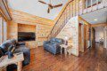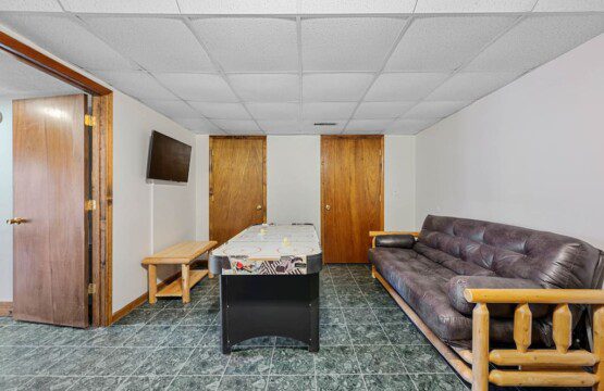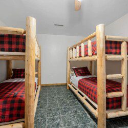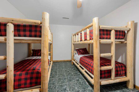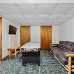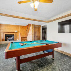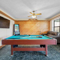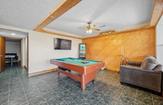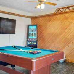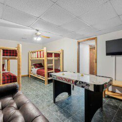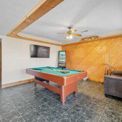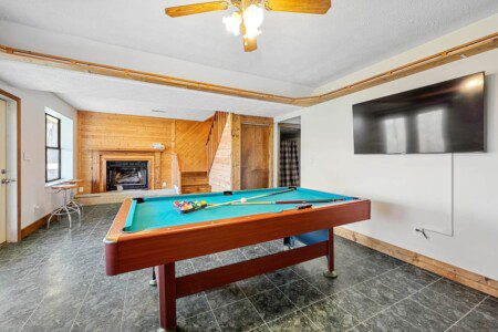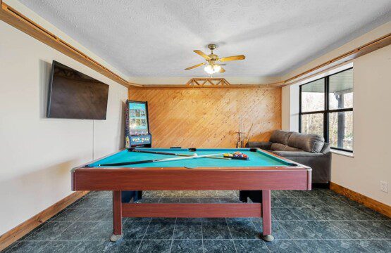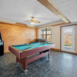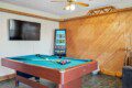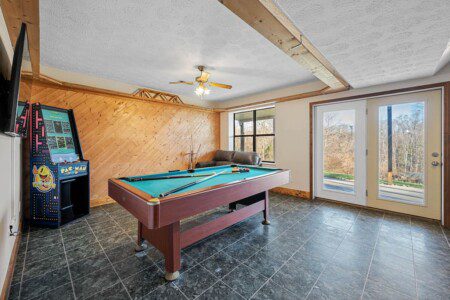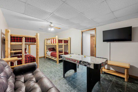 Located on the lower level of this beautiful cabin rental is a spacious game room with a pool table, multicade, fireplace, and TV. The back room offers two bunk beds and a futon, plus an air hockey table and TV. There is also a bathroom with shower on this level, plus the laundry room.