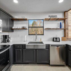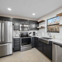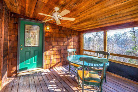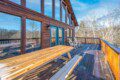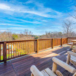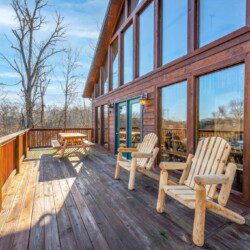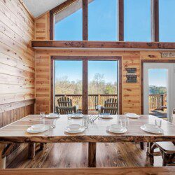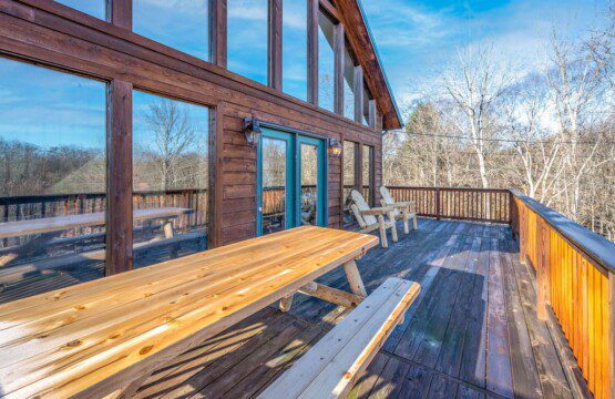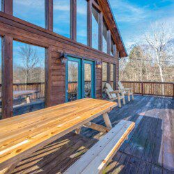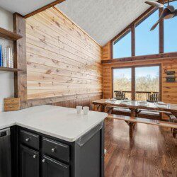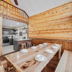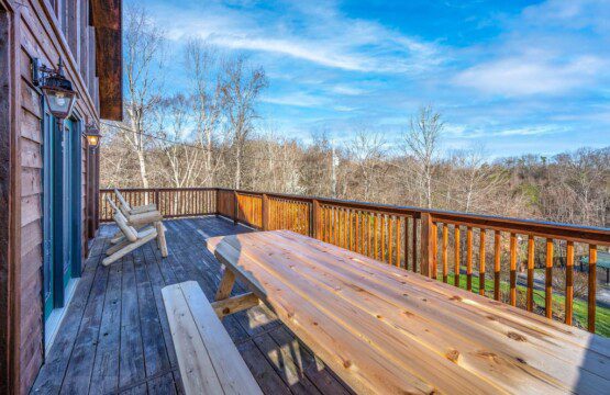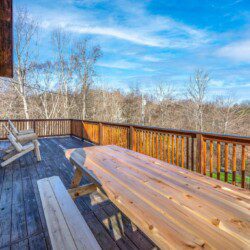 Adjoining the living room is the fully equipped newly renovated kitchen and dining area where you can prepare, cook and serve your favorite meals, all from the comforts of your log cabin getaway in Sevierville. In the warmer months enjoy outdoor dining on the picnic table or just lounge in the log Adirondack chairs while enjoying the views.