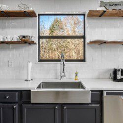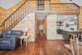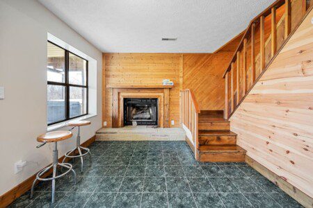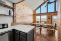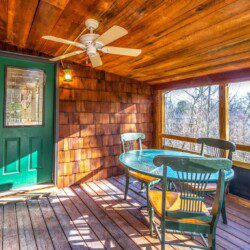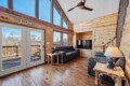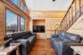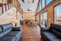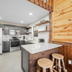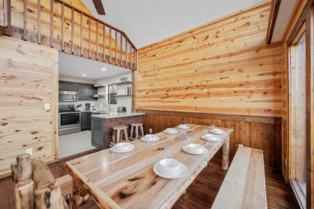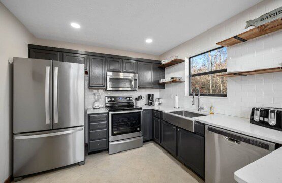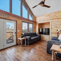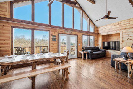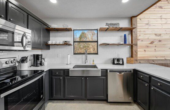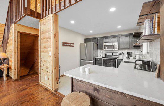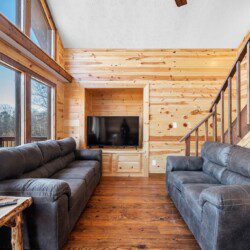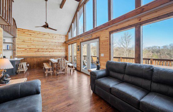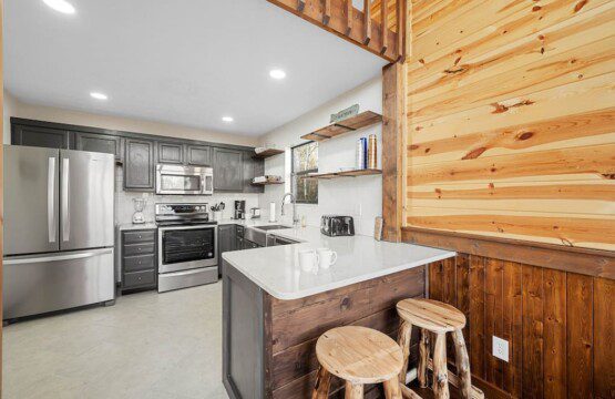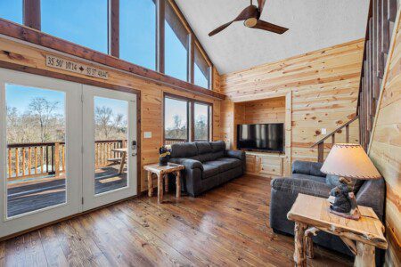 The main level of Smoky’s Bunkhouse provides you with a wonderful living room with large windows and deck to fully enjoy the view, brand new couch, loveseat, and TV.