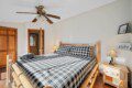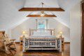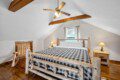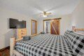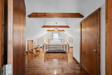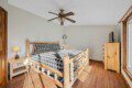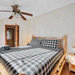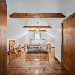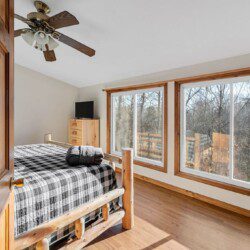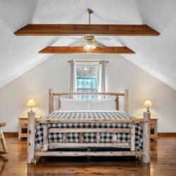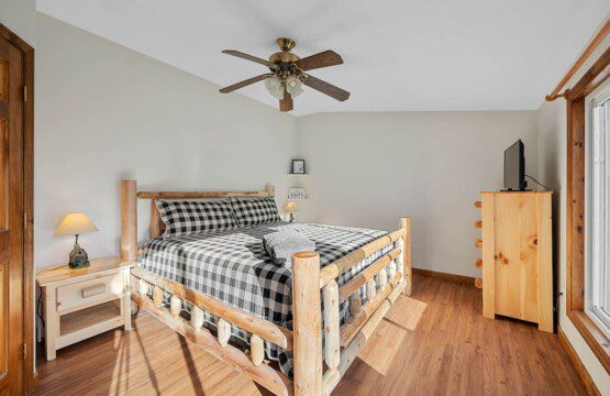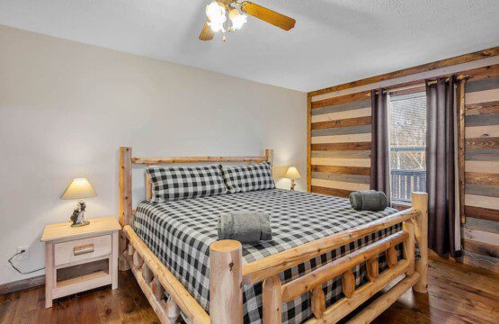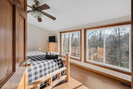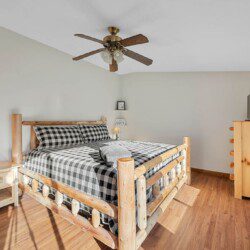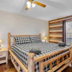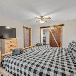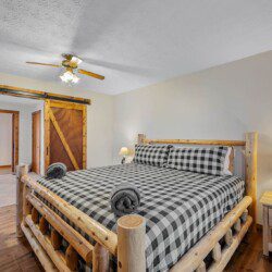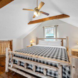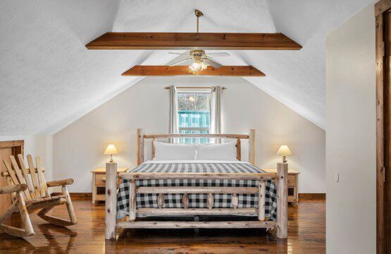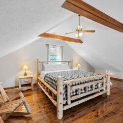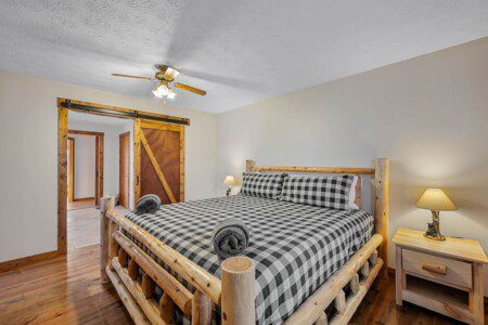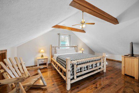 The upper floor at Smoky’s Bunkhouse is entirely dedicated to the third luxurious bedroom that features a king bed, log rocking chair, and new TV.