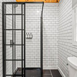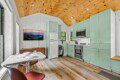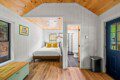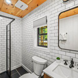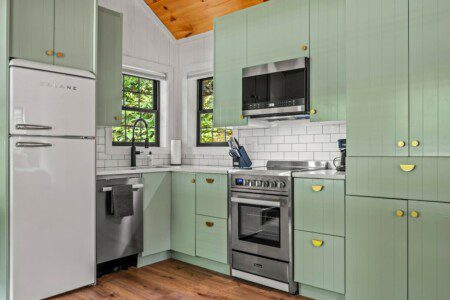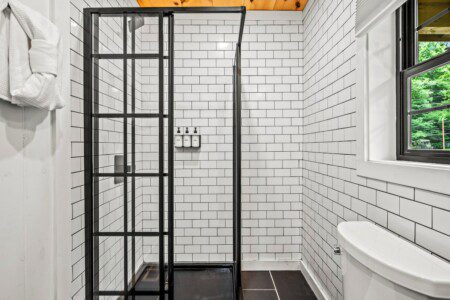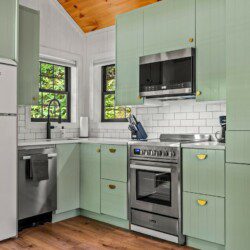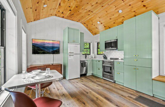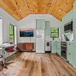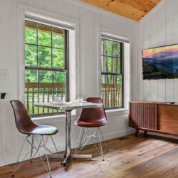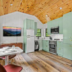 Step inside and be greeted by the snug ambiance of Cabin 1. The queen bed is so comfy you’ll wonder if the mattress was stuffed with clouds. Whip up gourmet meals (or microwave popcorn) in the full kitchen, which boasts all the latest gadgets, including a refrigerator, stove, oven, and microwave. And for the culinary challenged, we’ve even included utensils! The intimate dining area seats two, perfect for a romantic dinner or a fierce game of cards.